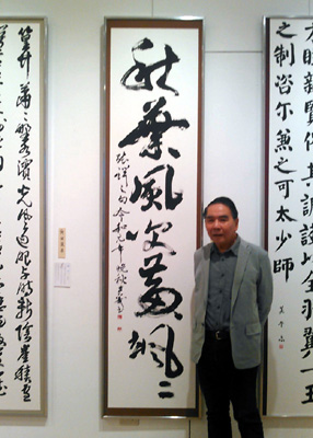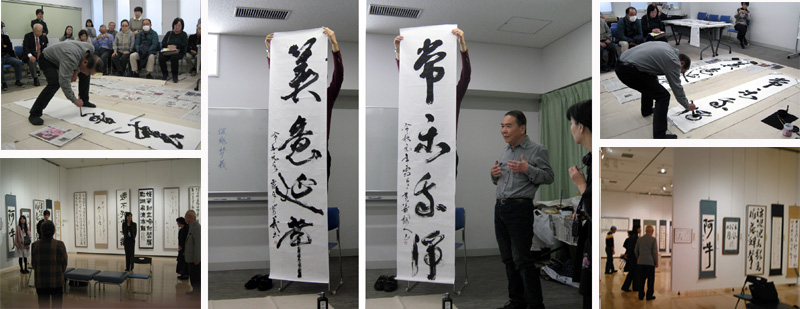 ▲写真中央は、二日目(11/10)の席上揮毫で披露した「美意延年」と「常楽我淨」を説明。