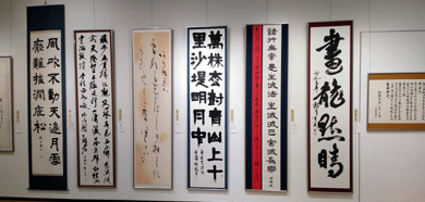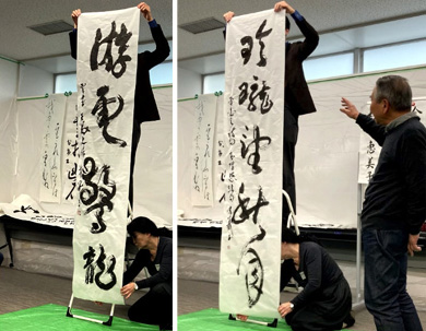 ▲伊東名誉会長の隷書(上)、綱会長のかな書(下)