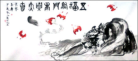 コラボ完成作品>虎画:安雲霽、書:塚越梦羲(右から)五福臨門庚寅大吉