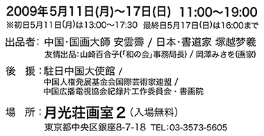 「和の会」の中国側代表である中国・国画大師:安雲霽(あんうんさい)氏と、日本側代表で書道家:塚越梦羲(つかごしぼうぎ)氏は、日中文化の交流をより深めるため、2009年5月11日から17日まで、東京銀座にある月光荘画室2にて「和の会」展を開催いたしました。